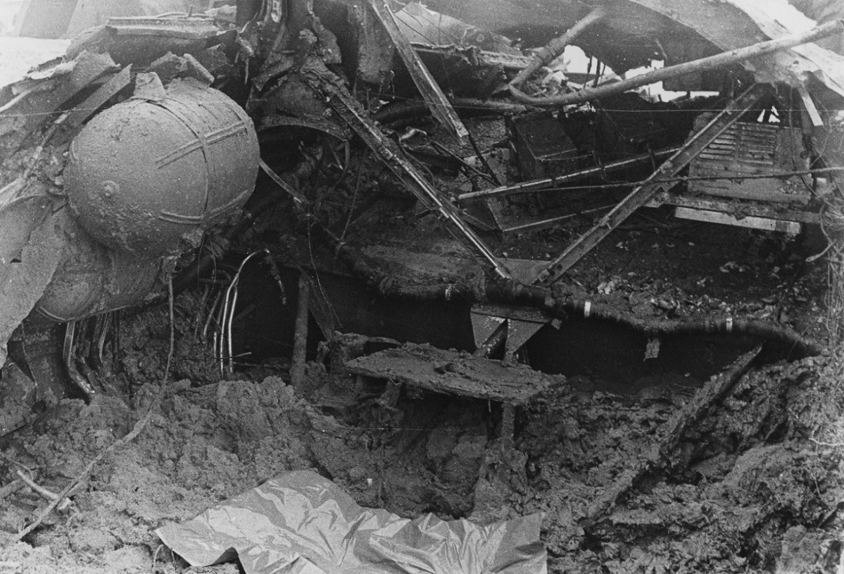 Below, 1975. A soldier of the Dutch AF Recovery Unit and two men of the Dutch Army Grave Recovery and Identification Unit, Adjutant Arie van der Graaf and his trainee Sgt. Harry Jonge (later the successful tracker Captain Harry Jonge 'de Neus/the Nose'). They inspect the cockpit floor at the controls and look at the remains of pilot Kent Miller.