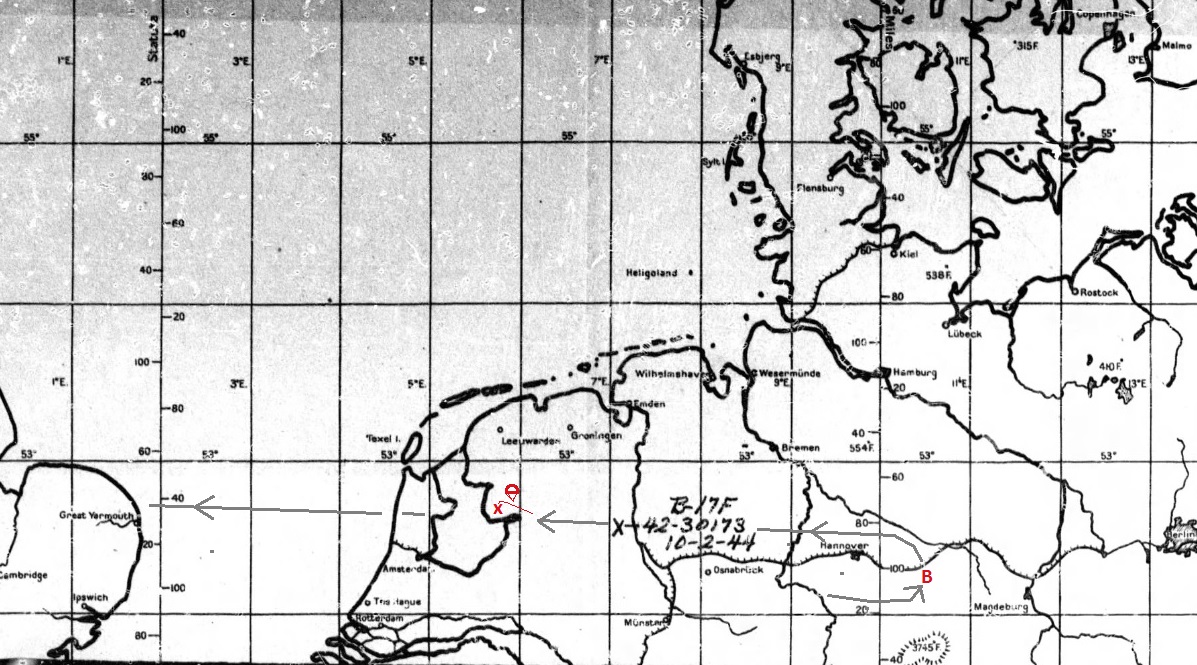 Dropped out formation, damaged, near Dutch-German border on the return to England. Again attacked by fighters as straggler. Three men bailed out when there was still enough altitude east of the polder at Ossenzijl. Two could evade. The aircraft made a nearby belly landing in the Northeast Polder, NW of former Schokland Isle. Remaining seven crew were made POW not far from plane. |