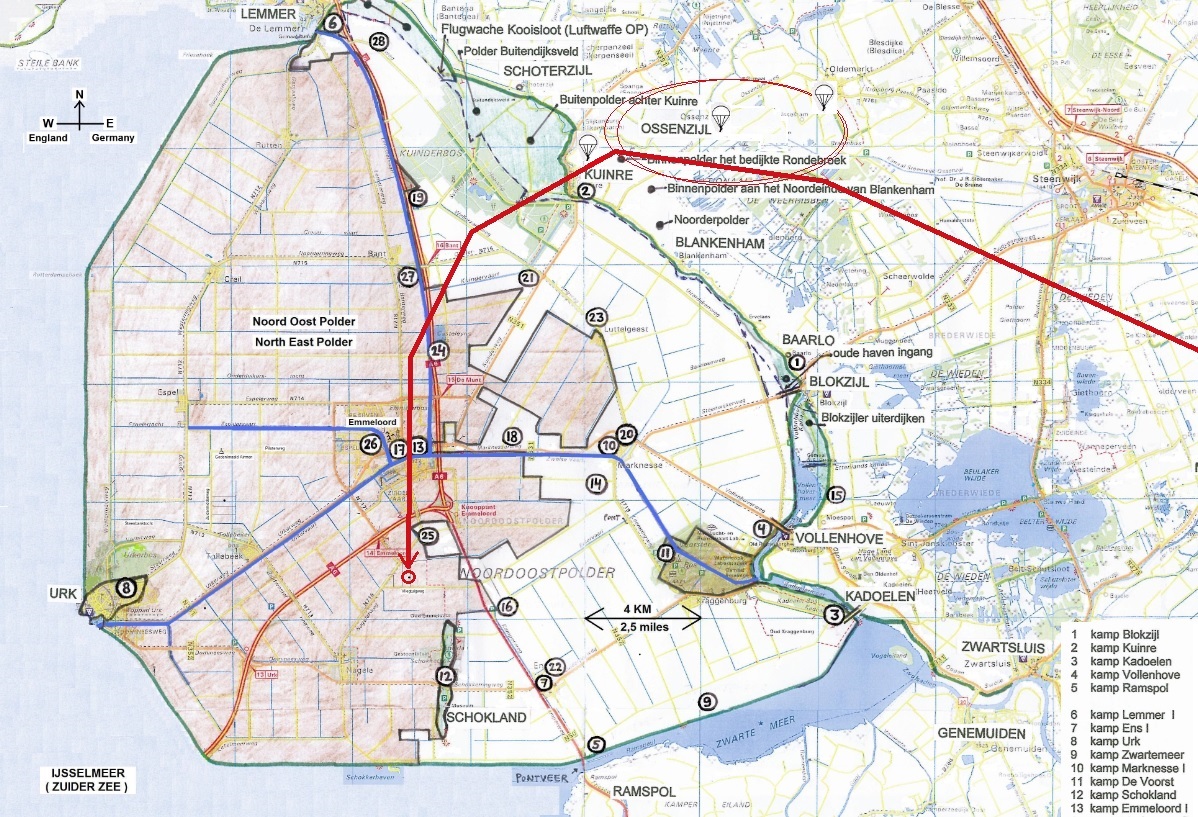 Some of the crew wrongly believed they got down near the Dutch town Leeuwarden, but this was only because the name of this town was the nearest reference point on their map (above). In reality, Leeuwarden was 40 miles away. Pilot Sharpless knew very well he landed near the edge of Lake IJsselmeer (Old Zuyder Sea), in a polder, an area that was water two years before and still a mud-flat when he made the belly landing. Sharpless: