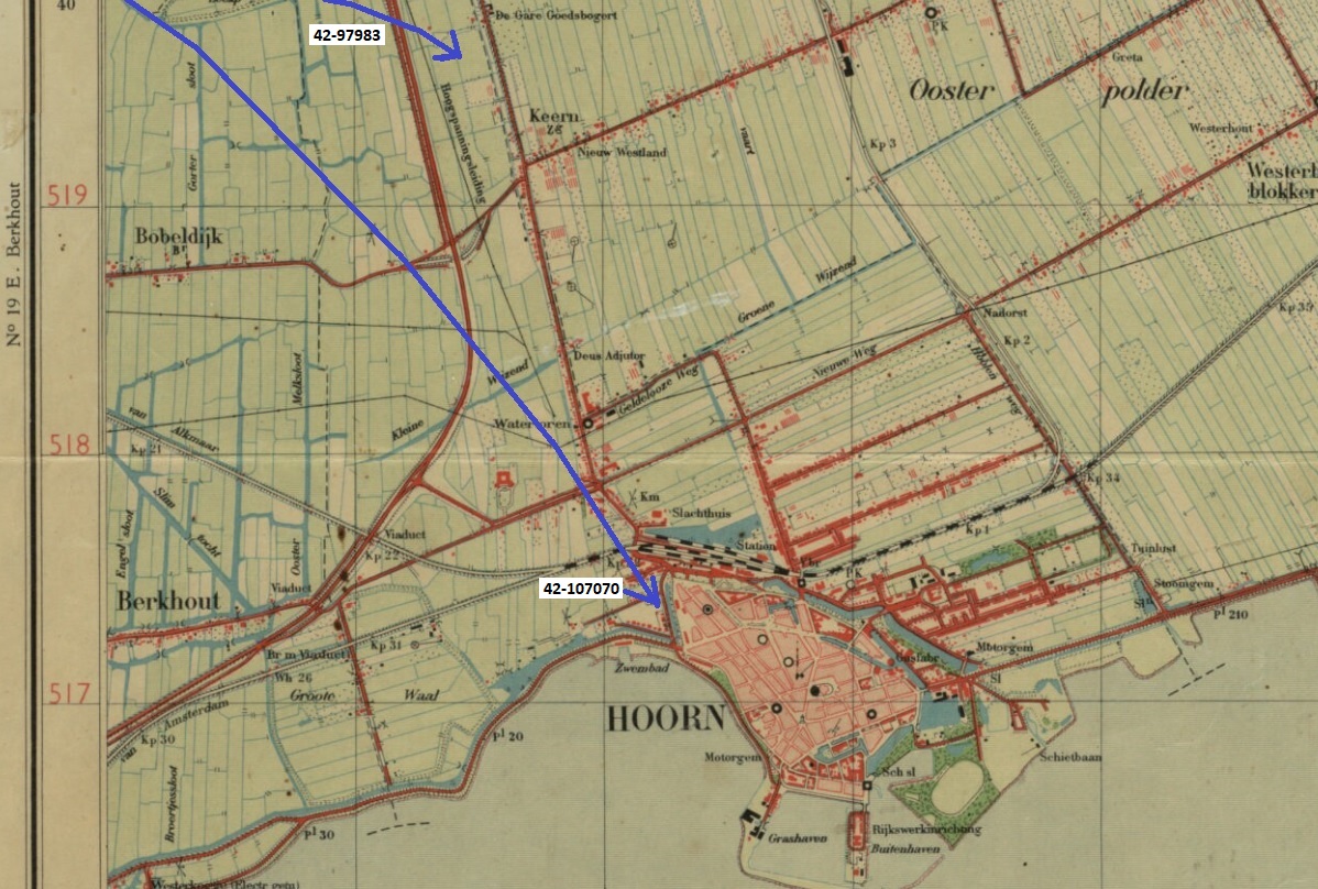 Below. Lt. Larue F. Gribb's '97983' aircraft came down in pieces at hamlet Keern at Farm 'De Gare Goedsbogert', address Keern no. 217. In the cabbage fields west of Keern and the road to Den Oever (today highway A7, north of todays ice skating stadium, Roskam street). Lt. Lawrence J. Gregor's aircraft '107070' fell on the Western outskirts of Hoorn, on the lawns of Westersingel and Pelmolen street. Close to the entrance of the shopping streets, opposite to the new theater Schouwburg 'het Park'. Both bomb loads were not armed yet and all bombs went unexploded deep in the soft ground.