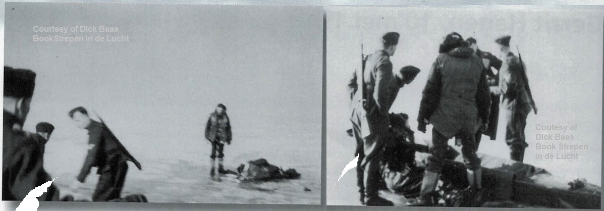 When reaching shore south of Elburg the next day, February 12, 1941 at 16:00 (after 16 hours and 15km), the survivors were spotted and taken prisoner by the Germans. All five underwent medical treatment in the special (bugged) ward for Allied airmen in the Wilhelmina Hospital in Amsterdam. Shortly after that, the stay in the German Stalag prison camps commenced. Sgt. Hall was operated in the famous Obermansfeld Hospital near Frankfurt in Germany where his shank was amputated. Amazingly, in 2009 six photos came from Germany showing the arrest when the five survivors came to shore, see below.