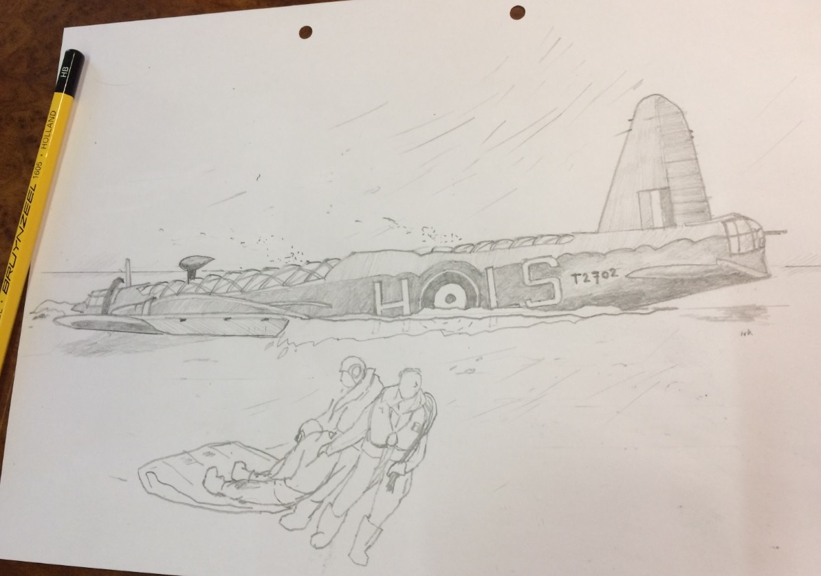 ABOVE IMAGE. A drawing based on the German photo 13 February 1941. Showing the T2702 of 15 Sqn (LS-H) as the Germans found it on the frozen lake. And the wounded Sgt. Hall on the parachute, as he was dragged to Elburg by his crew the day before. A week later the Wellington broke through the ice and landed on the lake bottom, only 3 meters deep. The frozen body of Sgt. Glyndwr Reardon was at that time still inside the front turret. Six and 26 years later (in 1947 and 1967) remains of him were found.