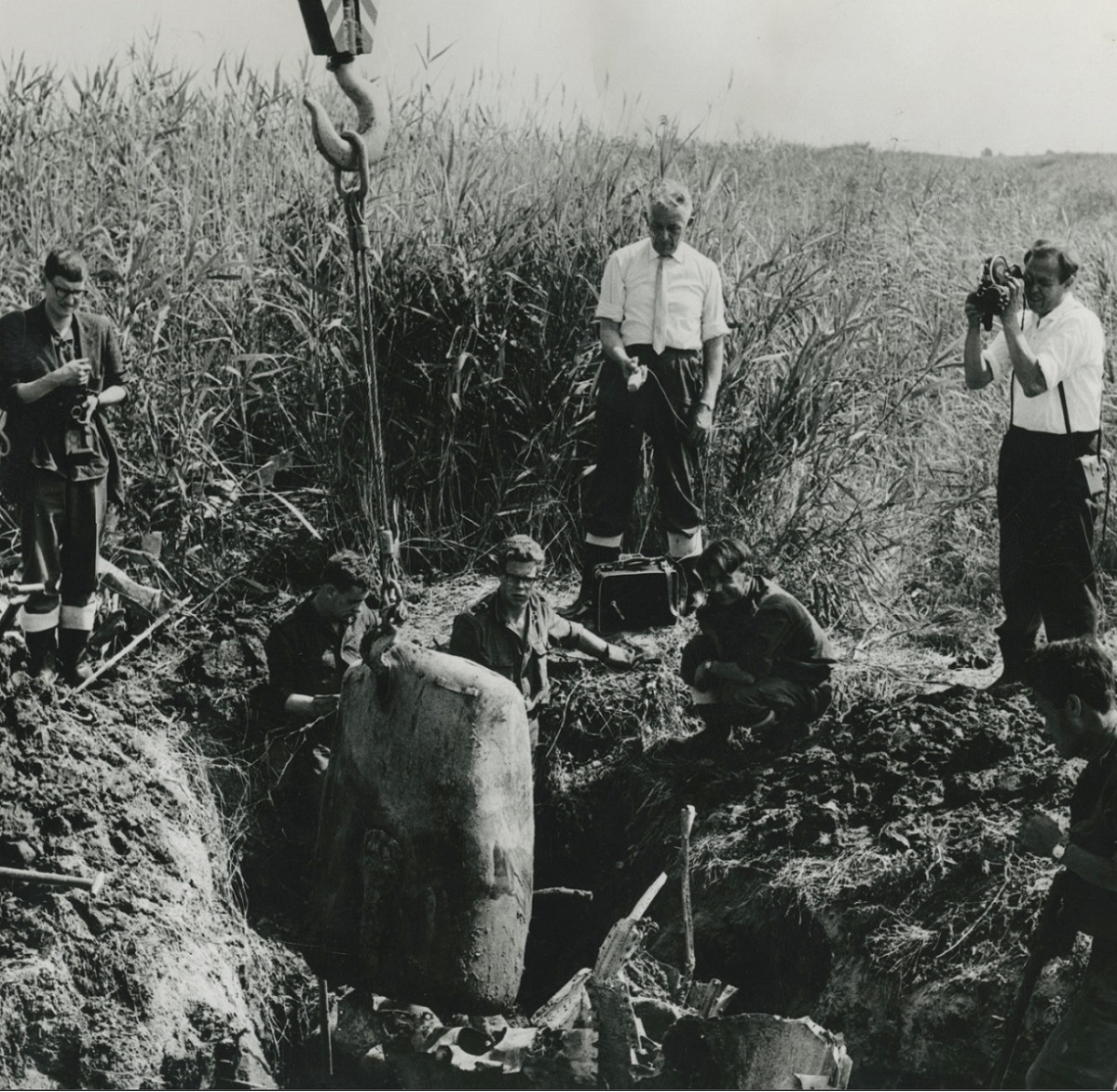 On 31 May 1961 the Dutch Department for Polder-construction 'Dienst Zuider Zee Werken' (ZZW) wrote a letter to the Dutch Airforce, that remains of a German fighterbomber were encountered while digging a canal in section G-118, today just east of Lelystad. ZZW requested removal of the wreck. The recovery team of the Airforce took action but could not do much because the soil was still very wet (former seabed) and it rained constantly. A year later, end July -begin August 1962, the recovery team lead by Sgt. Hinssen returned to this location, which was by then overgrown by reeds as far as the eye could see. It was already the 7th aircraft wreck that Hinssen and his team had to work on since they entered the polder for the first time May 3rd 1960.