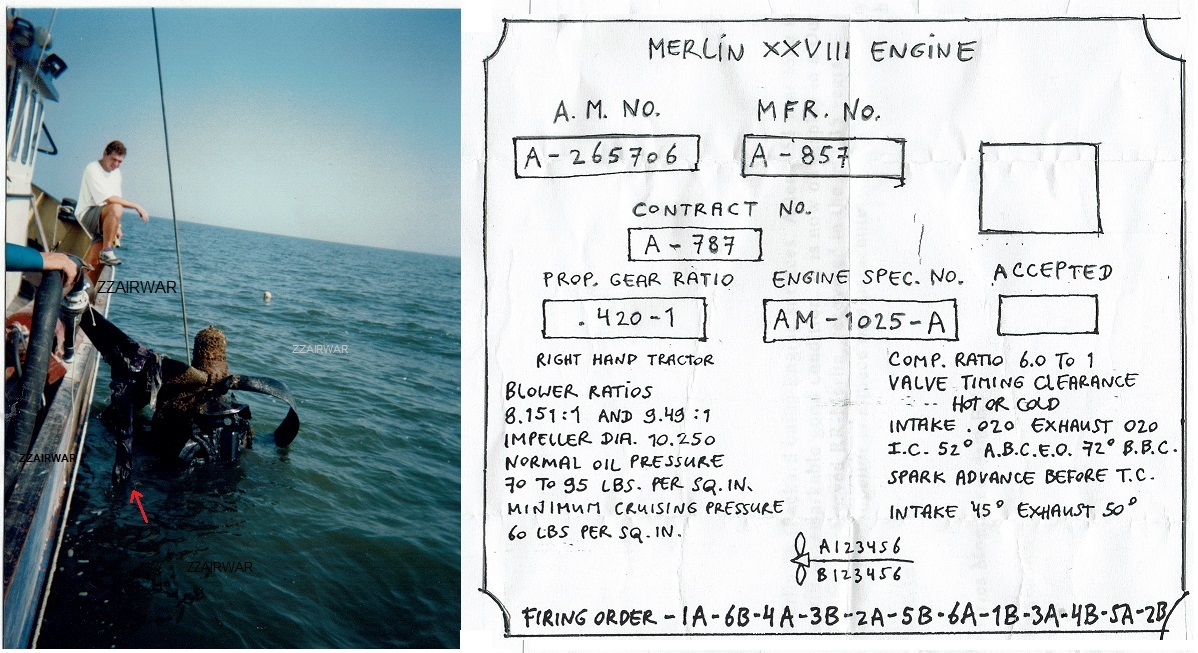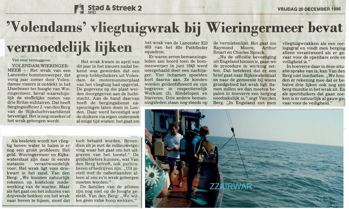 In March 1996 the wreck, in remarkable good condition thanks to the emergency belly landing in 1943 in which it flipped over and the fresh water in the Lake, was found by fishing boat VD64 and reported to the authorities. The VD64 took an engine serial number plate off one engine (Rolls Royce Packard Merlin 28, see photos below). With this Dutch Air Force Recovery Officer J. van den Berg and the RAF coud identify the wreck as the since June 1943 missing ED603. A half year later, for publicity reasons to speed up the recovery procedure, the VD64 took an engine with propeller off and delivered it by truck (truck and driver provided for the just cause by Sierbestrating Jonk BV) at the museum of the ARG 40-45 in Heemskerk (Fort Veldhuis).