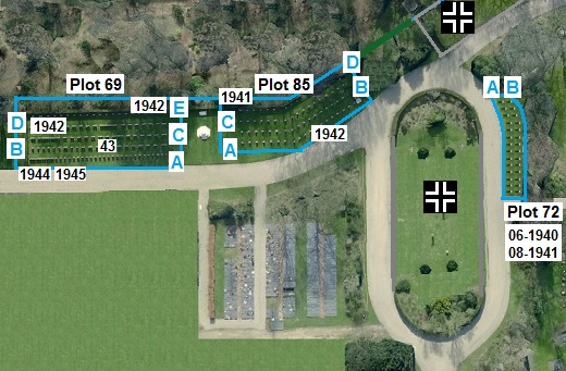Plot 72, row A & B. Single one coffin graves (39 men). Full August 1941. Post war transferred to Plot 85 and 69. Plot 72 was never used again and is an empty field today.