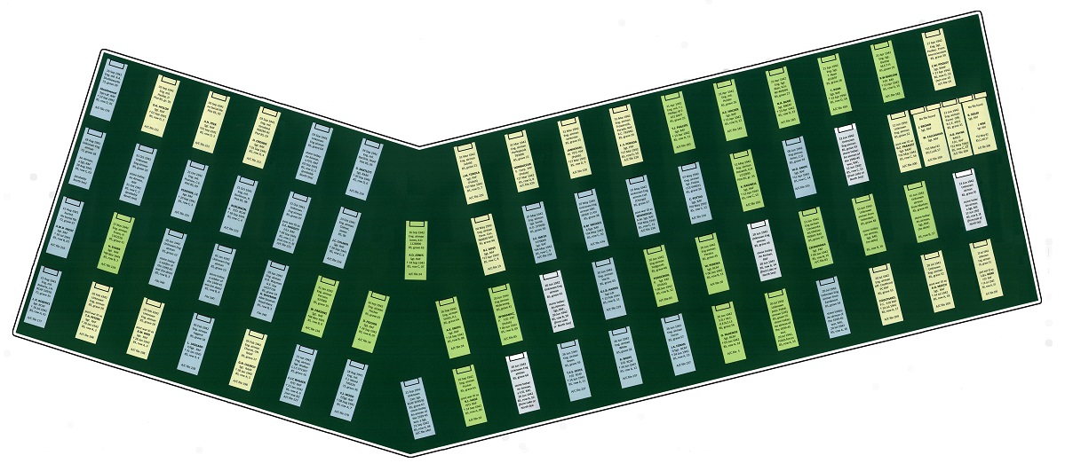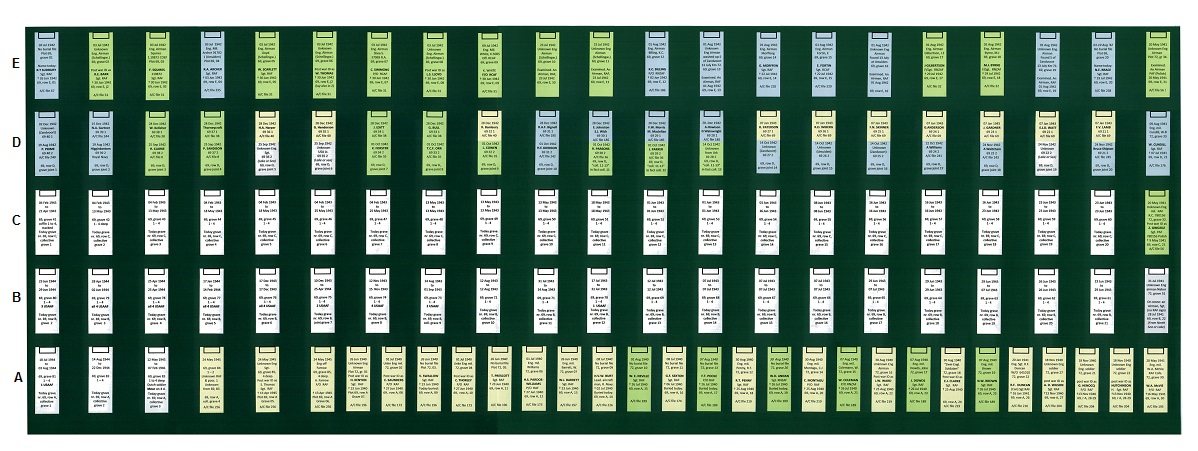 Row E (back-row) single graves 1942. Row D, double graves 1942. Row C, quadruple graves 1943. Row B, quadruple graves 1943-1944, Row A (path) today mostly single graves. Green colour: from Lake IJsselmeer (Old Zuyder Sea). Blue: North Sea. Sand colour: crash on land. White colour are quadruple graves with a combination of Lake-Sea-Land casualties.