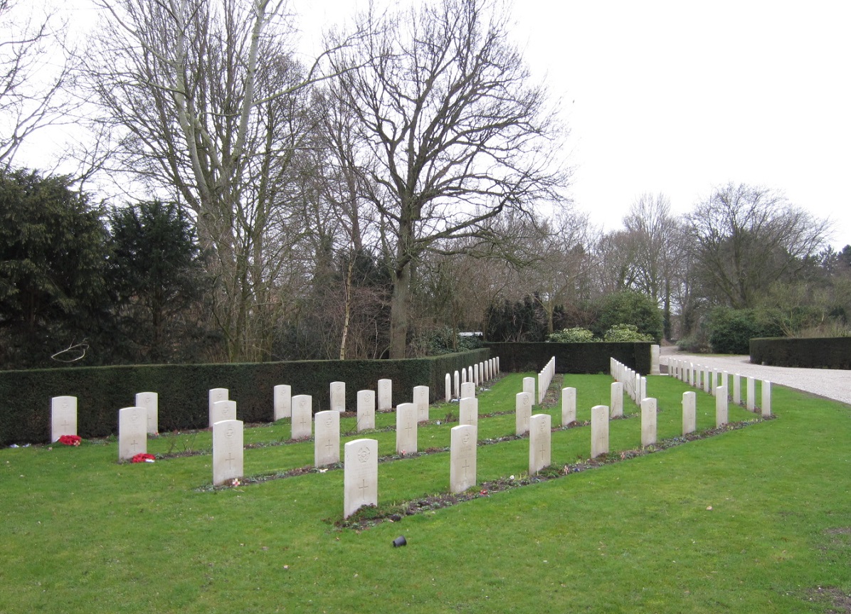 In 1940 the casualties in first Plot 72 were 3-men crews of the RAF Blenheim light bomber. They made individual attacks on the Dutch coastline, Germany and German shipping on the North Sea. Later in 1940, 1941 and begin 1942 the Blenheims were followed by RAF Whitley, Hampden and Wellington bombers. These were 2-engined bombers with a 5 men crew. When in 1942 the bombers streams to Germany grew and aircraft became larger (RAF Stirling, Halifax and Lancaster 4-engined bombers with 7 men crew), the New Eastern Cemetery could not keep up with the number of burials and ran out of space. Up to then each grave had received one coffin per grave (single grave). This changed 19 August 1942. The 2nd row on Plot 69 (row D) received two coffins per grave. Thanks to this capacity on this row increased to 20 x 2 = 40 coffins, but it helped only until December 1942.