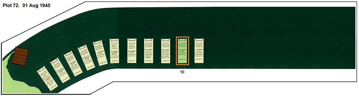 On 23 June 1940 (daylight) the RAF attacked with Blenheim light bombers the German industry in Vohwinkel (Wuppertal) and the railway yards in the German town Soest. Two Blenheims crashed at Amsterdam. One on a farmland in Amsterdam-West near Spaarnwoude/Halfweg (Blenheim IV L8754, P/O T.C. Prescott) and the other in a meadow in Amsterdam-West, today the Sloterplas pond (Blenheim N3593, F/Lt. Stephens POW). Four crew members were buried here on 26 June 1940 in this empty plot: Sgt. Kenyon (grave no. 1), Sgt. Swallow ( grave 3), P/O Prescott ( grave 5) and Sgt. Barrett of N3593 (grave 7). They usually kept one grave spacing in between. Space was needed for the planking around each grave to stand on and lower the coffin.