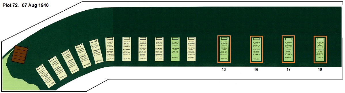 A week later four other crew of Wellington R3235 were recovered from the lake and buried. Pilot Officer Poole, Pilot Coleman (New Zealand), Sgt. Dowds and Sgt. N.W. Brown in grave 19. Sgt. Brown was fished up in the trawlnet of the VD46, skipper Jan Kes. He brought Brown's body to the Volendam harbour.