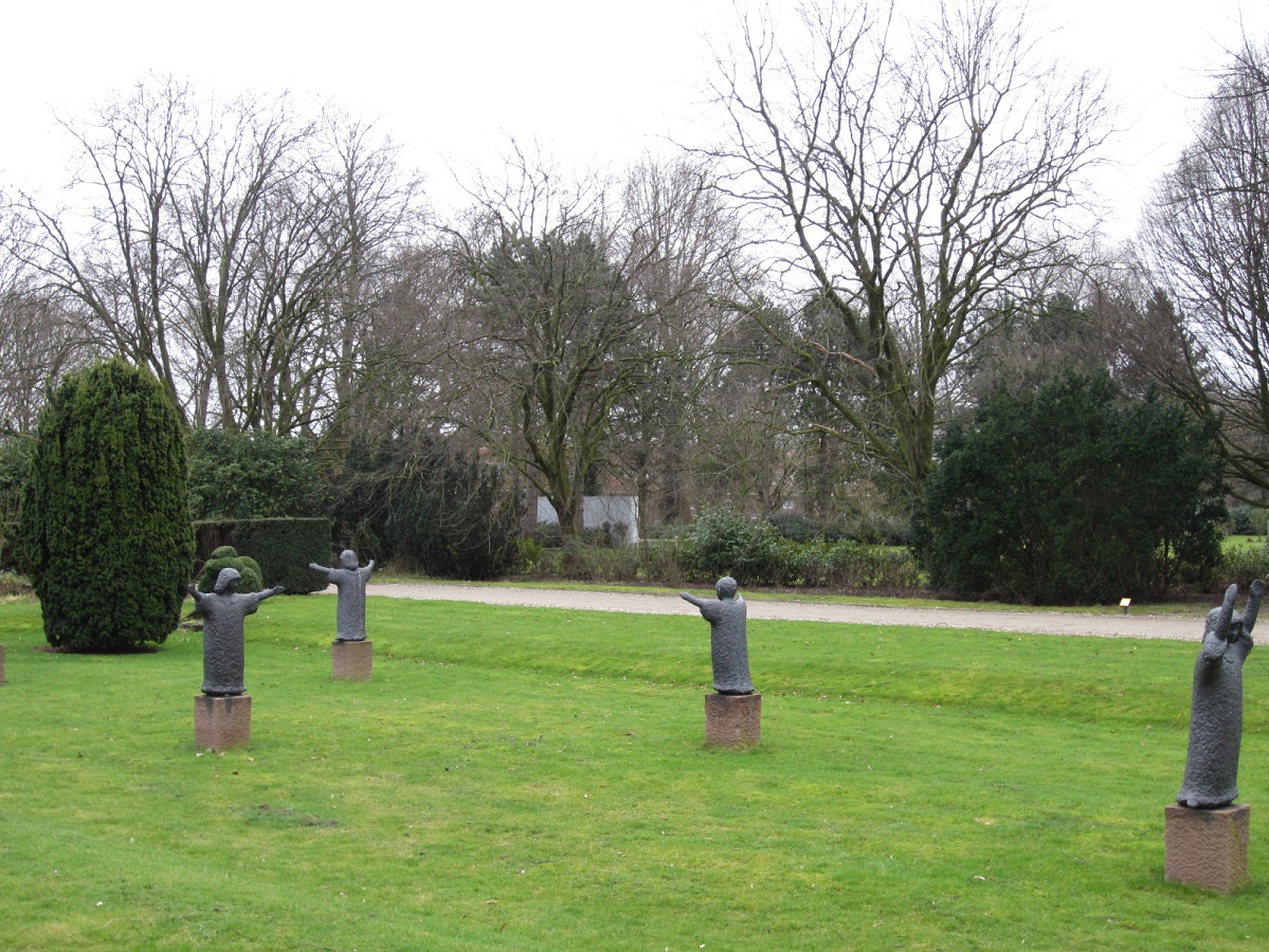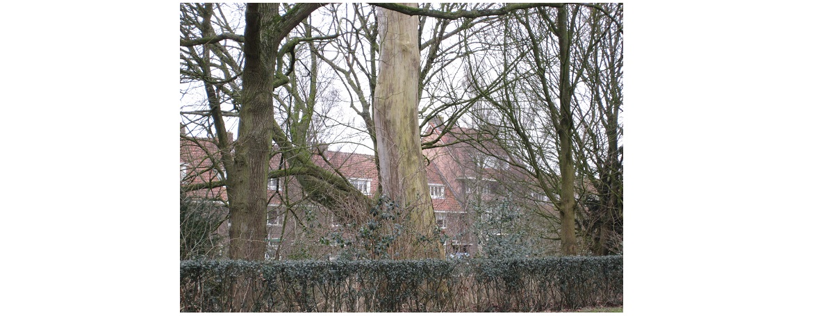Situation year 2012. Photo taken from the same angle as the above German burial. Former German Plot 70 is the field in the foreground, Allied Plot 72 is the stretch on the other side of the path. The trees are the same as in 1940, only bigger. After the exhumation of the war graves, both plots remained empty. We wonder if sculpturer Mr. Gerrit Bolhuis (1907-1975) knew about the history of this field.