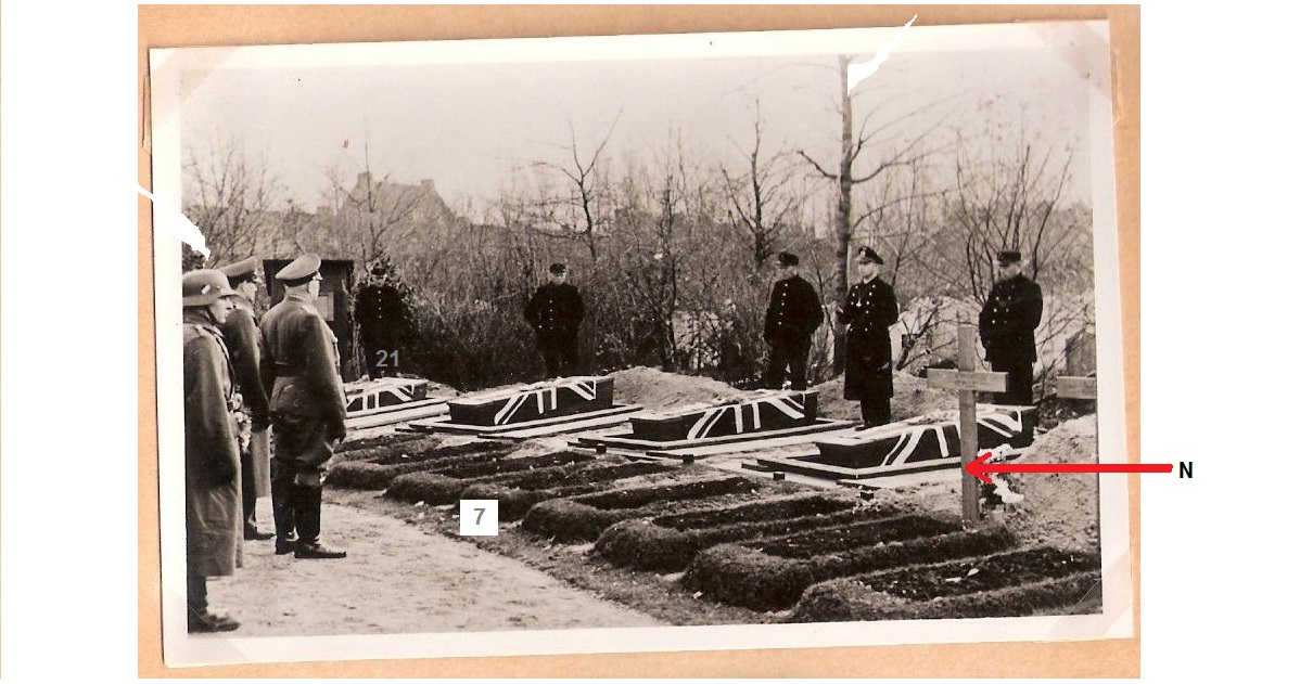 Below photo was sold by the German military photographer to civilians and a set was stolen from the overcoat of Hauptmann Dr. Pössel when he was in a cafe in Monnickendam. He is the officer seen on the back. It is often believed this scene is the burial of Flying Officer McVie on 20 May 1941, but that is not correct. This photo shows winter 28 Nov. 1940: the trees are bare, the German soldier left is cold despite wearing his overcoat. The German National flag decal on his helmet was abolished (taken off) in March 1941. The wooden cross on the right is grave 10 with engraved 'Sergeant Neville'.