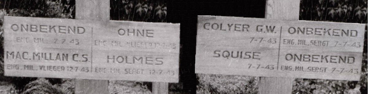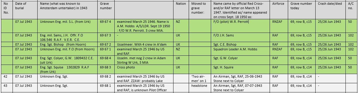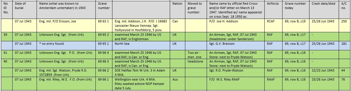 Of the above mentioned aircraft, in total nine RAF sergeants, a RAF Pilot Officer and a RAAF Warrant Officer (F/Sgt) are missing in action. In Urk they recorded that one of the sergeants was a 'PO' (Pilot Officer), but on the headstone this became 'Sgt'. Five of them can be buried here in graves 65 to 69 (unknown numbers 39, 40, 41, 42 and 43). Headstone data is 'a Sgt, RAF, 7 July 1943, Known unto God'. One man has date 25 June 1943 engraved, possibly a missing sergeant of SOE Halifax DG405. Names of the missing are: P/O Robert Higgins, Sgt. George Gordon, Sgt. Frank Groom, Sgt. George Cochrane (DG405), W/O Andrew Airy (RAAF), Sgt. George C. Green, Sgt. Thomas Atkinson, Sgt. George R. Johnson (HF544) and Sgt. William Hilditch, F/Sgt. Clifford J. Whitelaw (New Zealand), Sgt. Charles C. Mould (BK768). Also MIA Sgt. Hiram Davies and Sgt. John Welch of Lancaster W4367 (further below) can be buried here.