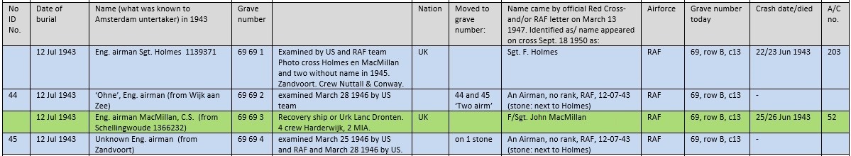 The ONBEKEND ('UNKNOWN' ENG. MIL.) on the photo above MacMillan, washed ashore at the North Sea beach at Zandvoort on 7 July 1943, buried here 12 July 1943. Also RAF, no rank. On the headstone today the date was changed into the burial date 12 July 1943.