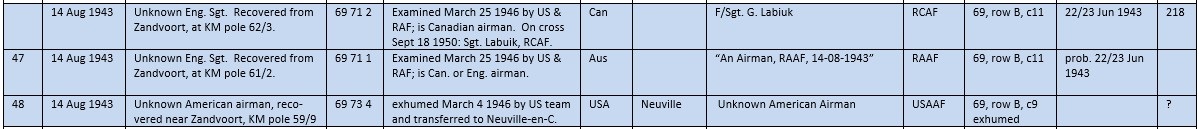 Combined the above two aircraft have eight men missing in action. The unknown airman no. 46 in grave 72-3 buried also 12 August can have a relation with those aircraft or at least this raid. As also Unknown no. 47 buried 14 August (coffin 71-1). He has no rank but was was post war identified as Australian.