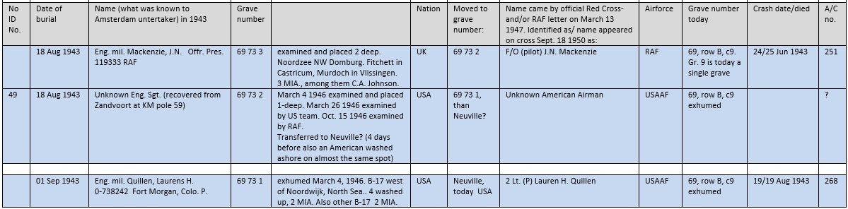 The other man (Unknown no. 49) proved after the war an American (as was the man who washed ashore on the same spot four days before). Mackenzie was buried between these two Americans in coffin 73-3. Grave 73 was closed on September 1st, with coffin 73-1 (upper coffin) with the remains of 'English Military Laurens H. Quillen, Fort Morgan, Colo.' This was American B-17 pilot 2Lt. Quillen, B-17F 42-5392 "Stric Nine",303BG. Shot down after a raid on Gilze-Rijen Airfield near Breda. Received Flak hits and came down in the North Sea off Hook of Holland. Two of this crew are still MIA in the North Sea, but they can not be the two (still unknown) Americans buried 14 and 18 August, because Lt. Quillen crashed on August 19.