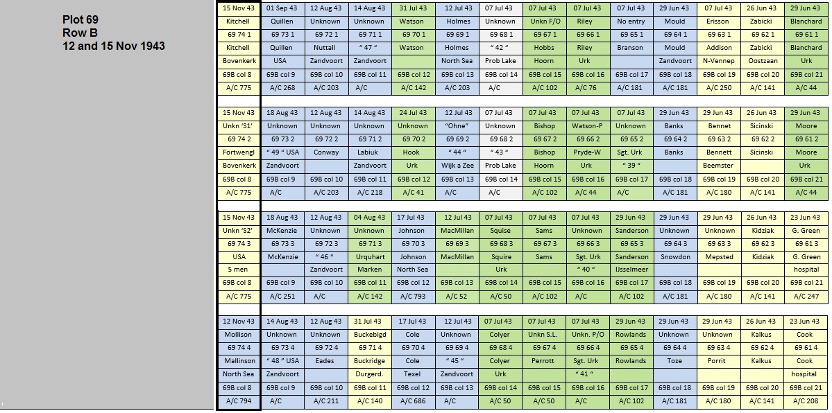 July 1943 until December, 47 airmen were buried centre of row B. Twelve deep graves were used, in each grave four coffins stacked. The RAF attacked the German war industry in the Ruhr Vally almost every night. The casualties buried most washed ashore at Urk (Lake IJsselmeer/Old Zuyder Sea) or the Amsterdam North Sea beach at Zandvoort. All crew of bombers, shot down by German Flak or nightfighters on route to or from the targets in the Ruhr Vally. Gradually the American airforce became active in the Dutch area. Among the 47 dead were 11 Americans, also bomber crews.
