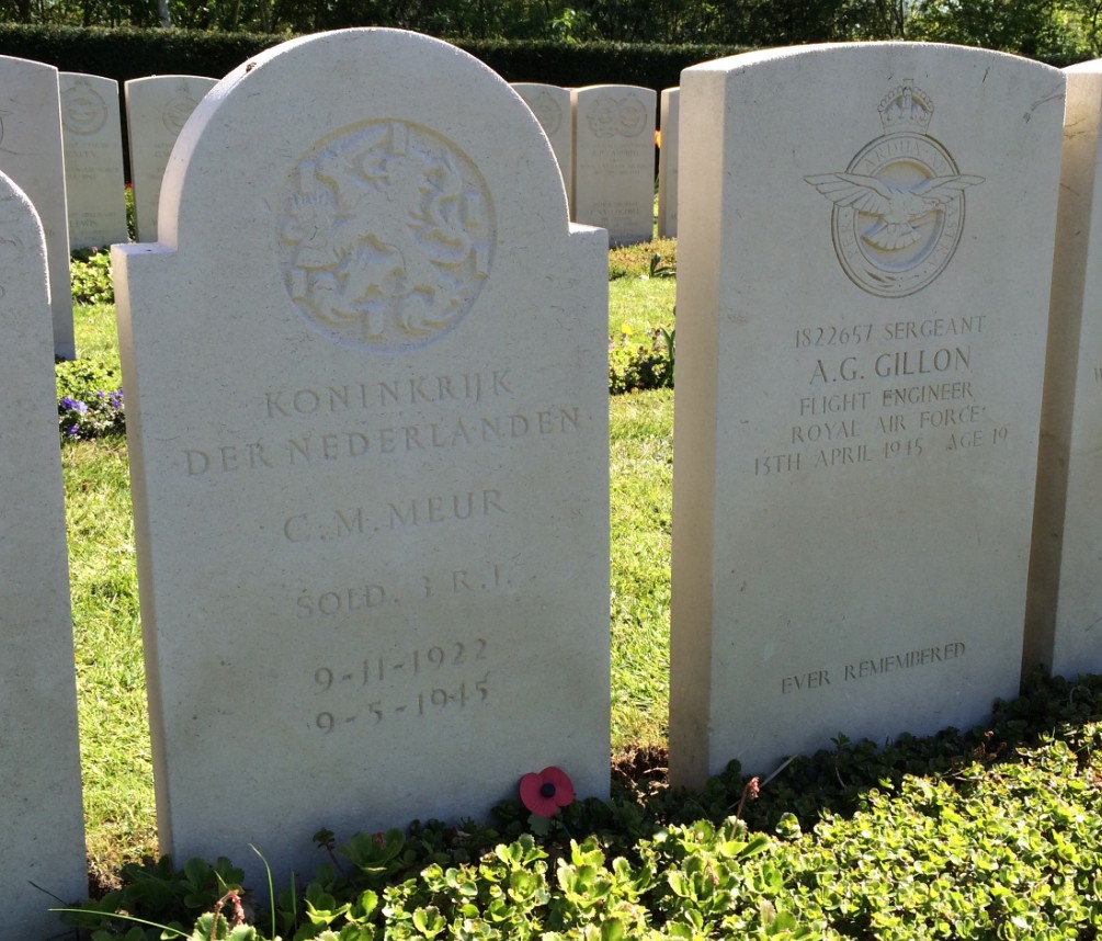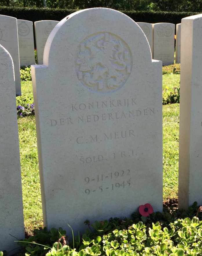 On the 9th of May 1945 a Dutch soldier was killed, this was C.M. Meur and he was buried here between 12 May and 24 May 1945 in grave 83, bottom coffin 83-4. After Meur, the crew of Halifax NA347 would be interred here by Canadian troops. These six airmen were the last Allied casualties buried on this cemetery.