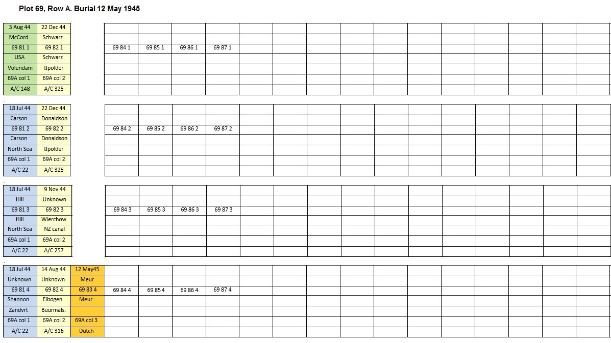 Headstone next to Meur today is that of Fl/engineer Sgt. Archie G. Gillon. Grave name became in 1945 "Plot 69, Row A, joint grave 3"