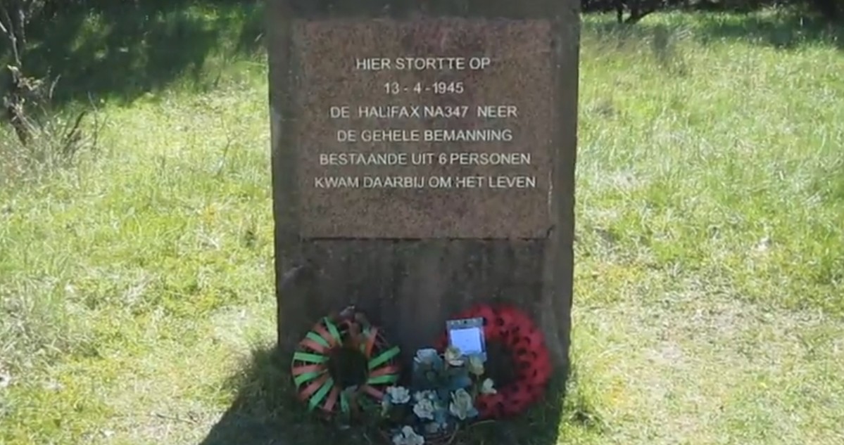 Halifax NA347 was a weapon dropper for the Dutch resistance. RAF Special Operations Squadron 298. In entered the Dutch coast at Zandvoort. This was in the night of 12/13 April 1945. It was flying at low altitude to stay under German radar, but was shot down by 20mm Flak on the coast line. It crashed with brute force and in flames in the dunes of the Amsterdam Drinkwater Company. The Germans were present at the location in minutes. Next morning they probably buried four bodies in a field grave near the crash site or in Zandvoort cemetery.