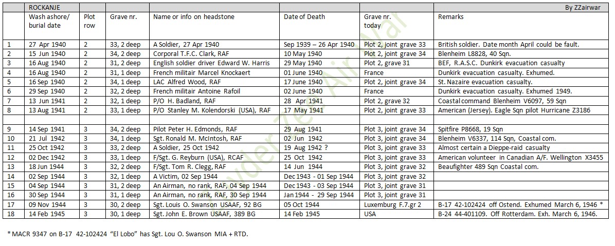 Rockanje General Cemetery Zeeweg (Mariarust). On southern entrance to Rotterdam Port. In the centre of the village on the 'Zeeweg' road is the old cemetery 'Maria Rust'. Closed for burials in 1950. Very well maintained, an isolated and almost forgotten war graves location. In nearby Hellevoetsluis (Smitsweg road) rest an unknown Canadian airman, no rank, buried 30 Dec. 1943.