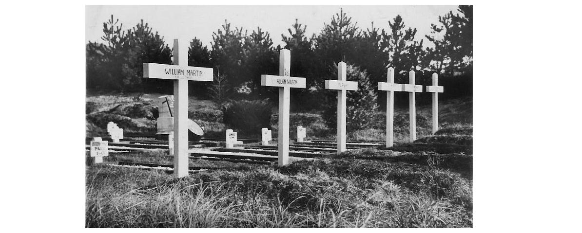 Photos below: left the three RAF airmen that were buried first, William Martin, Alan Wilson and Ryan. Right the crosses of three British that were found between the washed ashore French Dunkirk victims on 2 August 1940. The names on the crosses, left to right: J.O. Roberts, H. Richardson and S. Windle.