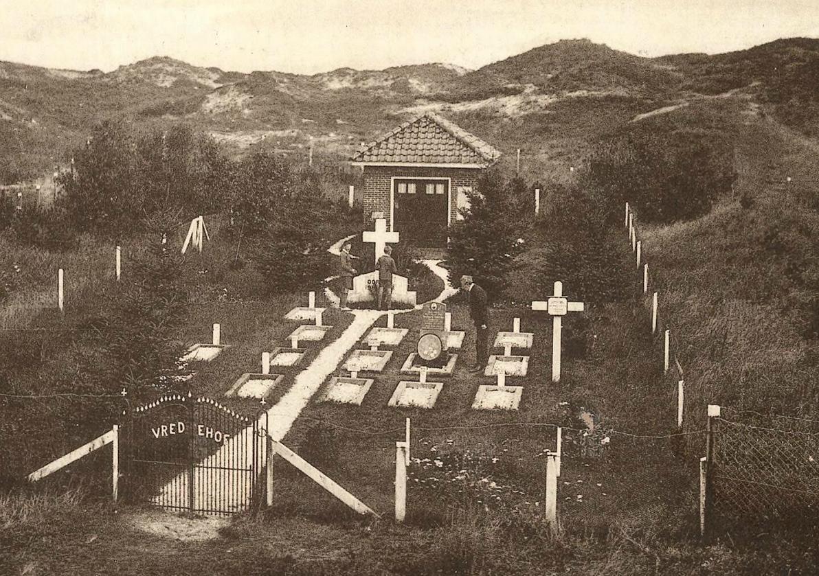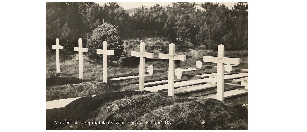 On 9 July 1906 an unknown British fisherman washed ashore, he was 65 years old. He was buried on a dune, one boot on his feet. In 1917, the space around his grave became the cemetery and his grave got grave number 1. In the first World War the cemetery grow with 12 graves, all washed ashore navy sailors: 11 German and one unknown British. Postcard below shows the situation in 1922, one of the first photographs of this cemetery. The perimeter is fenced off with chicken wire. White stone cross in the back reads 'Oorlog 1914-1918'. Cemetery gate is a steel rod fence with name 'Vredehof'. Tool shed/morgue behind the cross is not build yet. 'Vredehof' (Yard of Peace) is a Dutch translation of the German word 'Friedhof'.