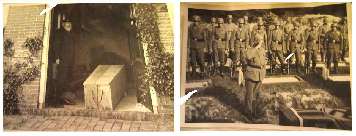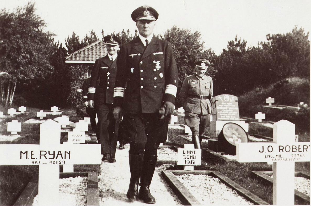 Photo below: on 4 September 1941 there was a funeral for washed ashore German pilot Oberfeldwebel Heinrich Schwiering (grave 61). At this funeral also a group of German navy sailors attended. A week later on 11 Sept, the cemetery and grave were inspected by this German naval officer. His rank is vice admiral. We believe he is Vizeadmiral Johannes Bachmann. He was Küstenbefehlshaber Deutsche Bucht, naval commander of this area from Feb. 1941 until June 1942. He was killed in April 1945 in a contact with American forces. On the right the grave monument and grave drum of Gerhard Spiessen are well visible.