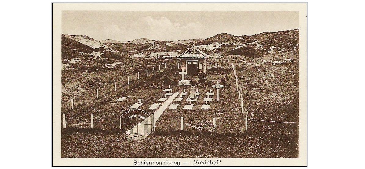 First grave dates year 1906, last 1968. Hundreds of sailors washed ashore on this island since medieval times. Originally they were buried without much formality at the foot of the dunes, often too close to the sea, which exposed the bodies again after a storm. From 1863 onwards, burials were made higher up the dunes along the road to the lifeboat station. In 1917, under pressure of a growing number of washed ashore WWI sailors, local townsmen among them hotel keeper Mr. Sake van der Werff took initiative to give the burial location a more permanent and dignified status. With help of the owner of the island at that time, German count Ernst August von Bernstorff (all his islanders were and are Dutch) a small cemetery was set up, Vredehof. It grew considerably in size during WW2. In this article the build-up of the cemetery is explained.