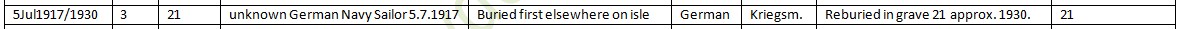 In April and November 1921, two unknown merchant sailors were buried in grave 33 and 21, near the cross. One of them had "L.F." in his clothes. Both were German.