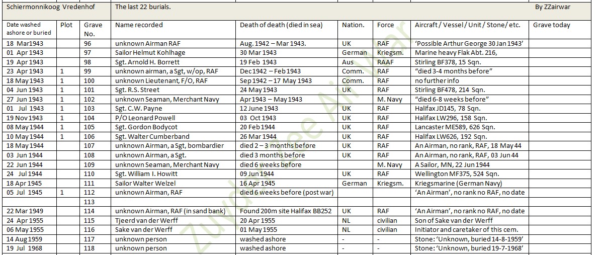 Grave 113. There are no recordings found yet of a use of grave 113. Last burial was (number) 112. Remarkable is that there are no American airmen here. Also no records found so far on exhumed American airmen. This in contrast to the other Frisian Isles. Info welcome.