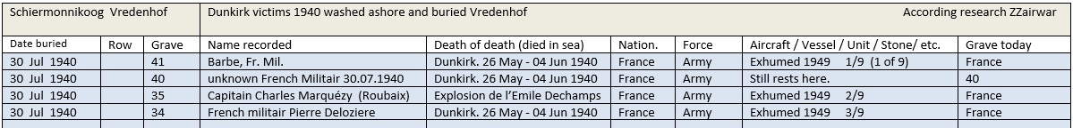 Dozens of French Dunkirk casualties are named on the French monument in their Dutch war-cemetery in Kapelle (near Goes, Netherlands). Website MémorialGenWeb investigated the names on the Kapelle monument. Combined with our files this provides interesting information on the men that are and were buried in Vredenhof: