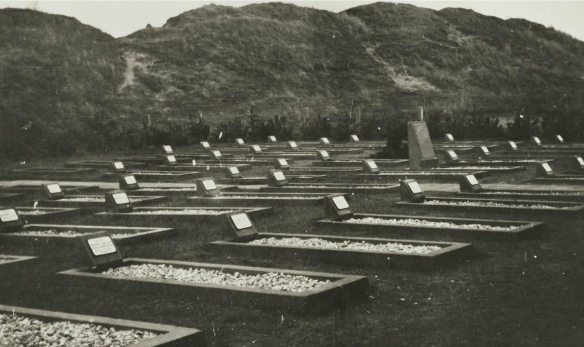 Below commercial postcard shows the situation end 1945. In that year the 1936-WW2 chickenwire fence and 'rising sun' gate were replaced by a cement wall and a new wooden gate with 4 white hourglass (sand timer) pillars. This would stand until 1957. The German sailor (1918) Gerhard Spiessen in grave 29 still has the large grave monument that his family placed in 1925, but within 5 years this would be removed and he got the standard stone.