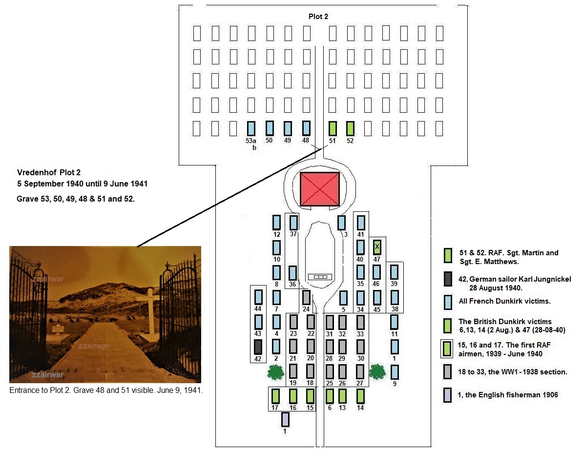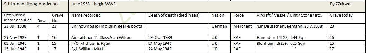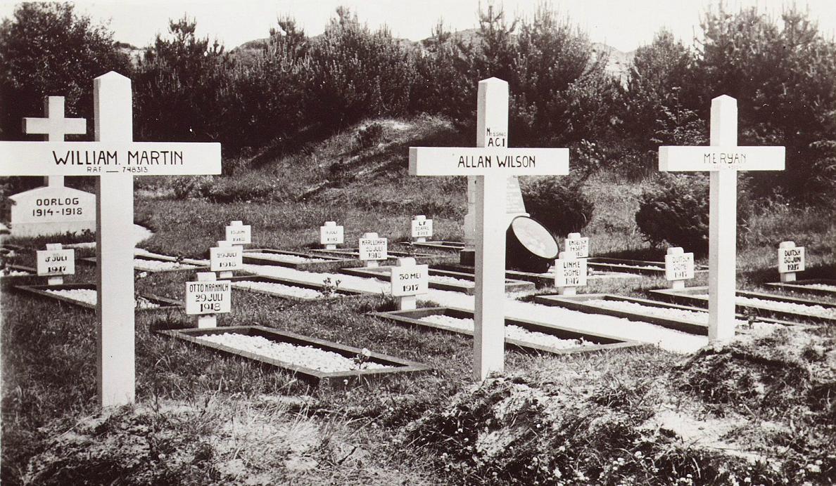 First was buried AC1 (Aircraftman 1st class) Alan Wilson, shot down 29 October 1939 (Hampden L4127) washed ashore (photos exist) and buried 29 November 1939 by Dutch and British officials. This island was occupied by the Germans 16 May 1940. They buried the next two washed ashore British airmen (1 and 15 June 1940) left and right of Alan Wilson. Left Sgt. William Martin, right his pilot Micheal E. Ryan. They were crew of Blenheim L9259, North Sea north of this island May 24, 1940.