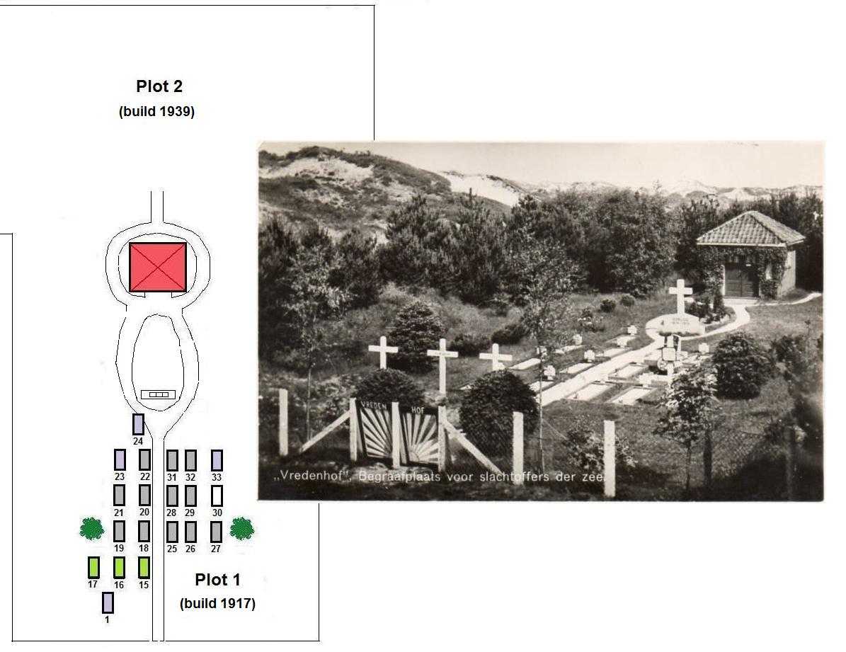 Vredenhof was and is a private cemetery for washed ashore victims of the sea. Because of WW1 and WW2 it became mostly a war cemetery. Organizations from different countries tried to take over control, but Mr. Sake van der Werff kept it independent. After his death in 1955, the management could not resist an offer by the CWGC for a new entrance. On Plot 2 the Cross of Sacrifice was placed for the cost of a grave position on each side of the cross.