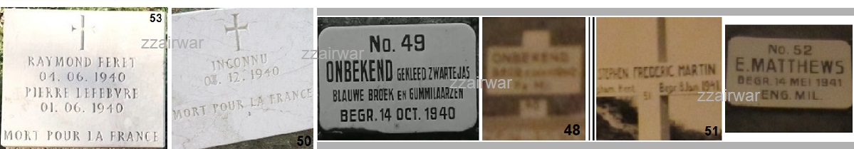 Grave 53. Double grave. Re-buried here 9 June 1941. Two French Dunkirk casualties, buried before begin August 1940 in another location near the sea. Later names on headstone here: Raymond Feret and Pierre Lefebvre. Raymond Feret was French Navy Quartier Maitre Radiotélégraphiste, stationed in Fort Louis (Castelnau) in Dunkerque. He was evacuee and killed in the sinking of the Emile Deschamps on 4 June 1940, as was Pierre Lefebvre, no rank or unit of him is known. They have as date of death 01.06.1940 on headstone, but this shoud have been 04.06.1940.