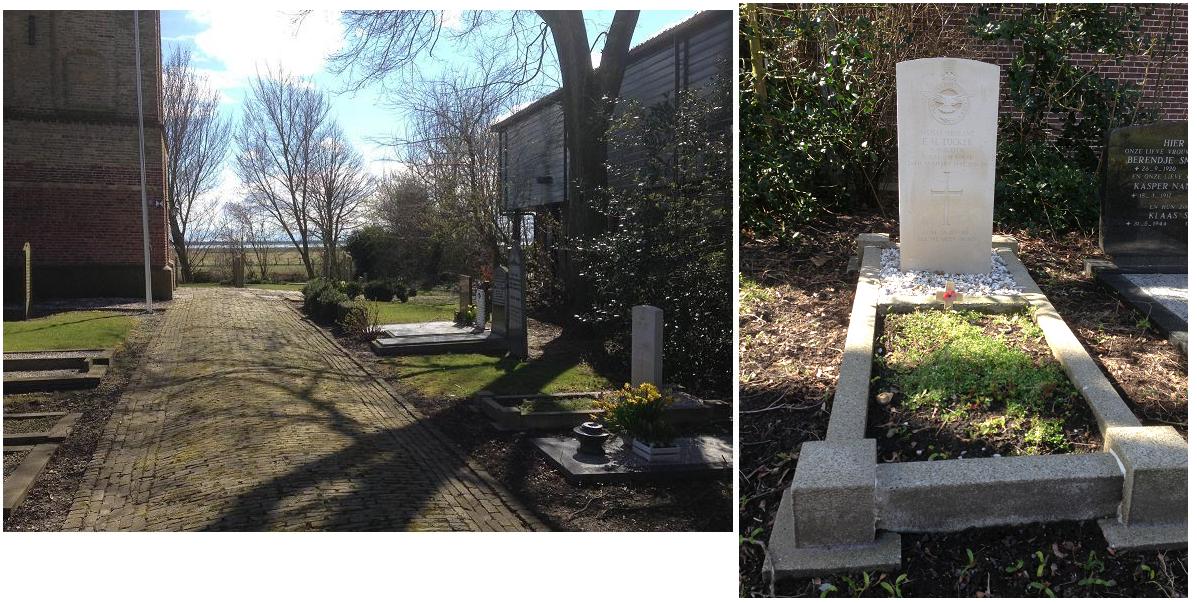 Sgt. Eric Tucker washed ashore and buried here. This was unusual because Den Helder Huisduinen was the designated cemetery for this coastline. Tucker was not buried on the yard behind the church, but on the right hand side of the entrance (photo below). It looks a temporary grave-position, as if they expected that he would be collected for burial in Den Helder within a few days. That never happened. In 1947 the 180 airmen in Den Helder Huisduinen were exhumed and reburied in Allied centralisation War Cemetery Bergen-op-Zoom in the south of the NL. Sgt. Eric Tucker stayed here. His grave is a lone reminder of the many Allied airmen that washed ashore here.