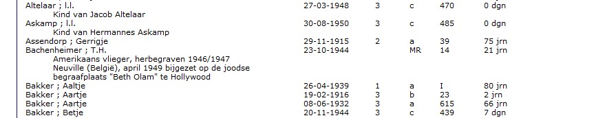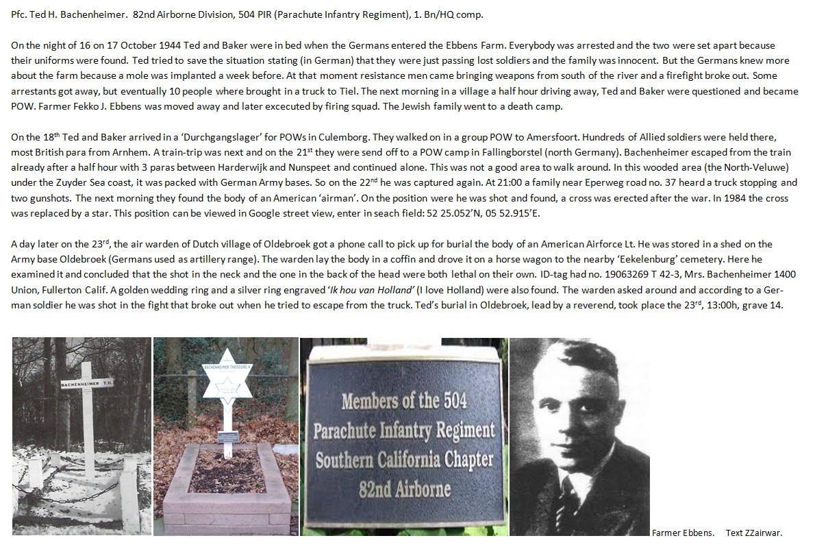 On the morning of October the 23rd 1944, an American soldier was found dead (shot) just 2 miles down the road of this cemetery. The front line was fixed at the time and lay 32 miles to the South of Arnhem. Not one of the civilians that had to bury him, knew or could imagine he was a scout of the 82nd Airborne and came from the front line. The only explanation for being so deep into German controlled territory was that he was an airman. So they buried him in grave MR 14 as 'Bachenheimer, T.H. American flying officer'. April 1946 he was exhumed and reburied in the US War Cemetery "Ardennes" in Neuville-en-Condroz (Belgium). In 1949 he found his final resting place in California.