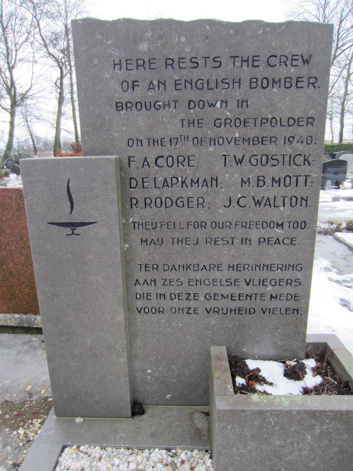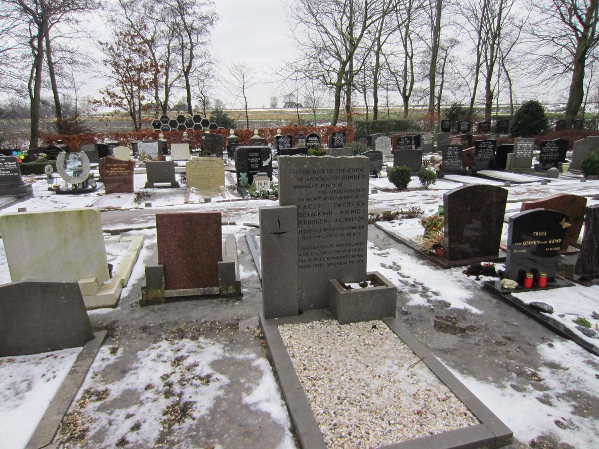 Small cemetery in the North. Rare in the way that the local monument from 1940 is still here and not replaced by the standard CWGC headstones. The crew of Wellington R9286 of 115 Sqn was buried here with all honours after a night-crash in a field nearby. The engraver of the stone had not enough knowledge of the English language (as most people in those days). He phonetically heard the text and chose in stead of 'Y' the Dutch letter combination i + j in 'MAIJ THEIJ REST IN PEACE' on the stone. It even looks ecclesiastical and more solemn. Below on the stone is engraved: "In grateful memory of the six English airmen that fell in our community for our freedom".