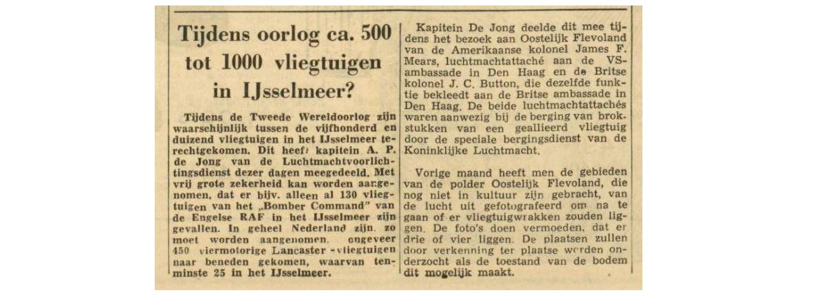 Newspaper article. Early 1960s Dutch Air Force estimated during WW2 some 500-1000 aircraft came down in Lake IJsselmeer (Old Zuyder Sea). Most locations unknown, unrecovered.