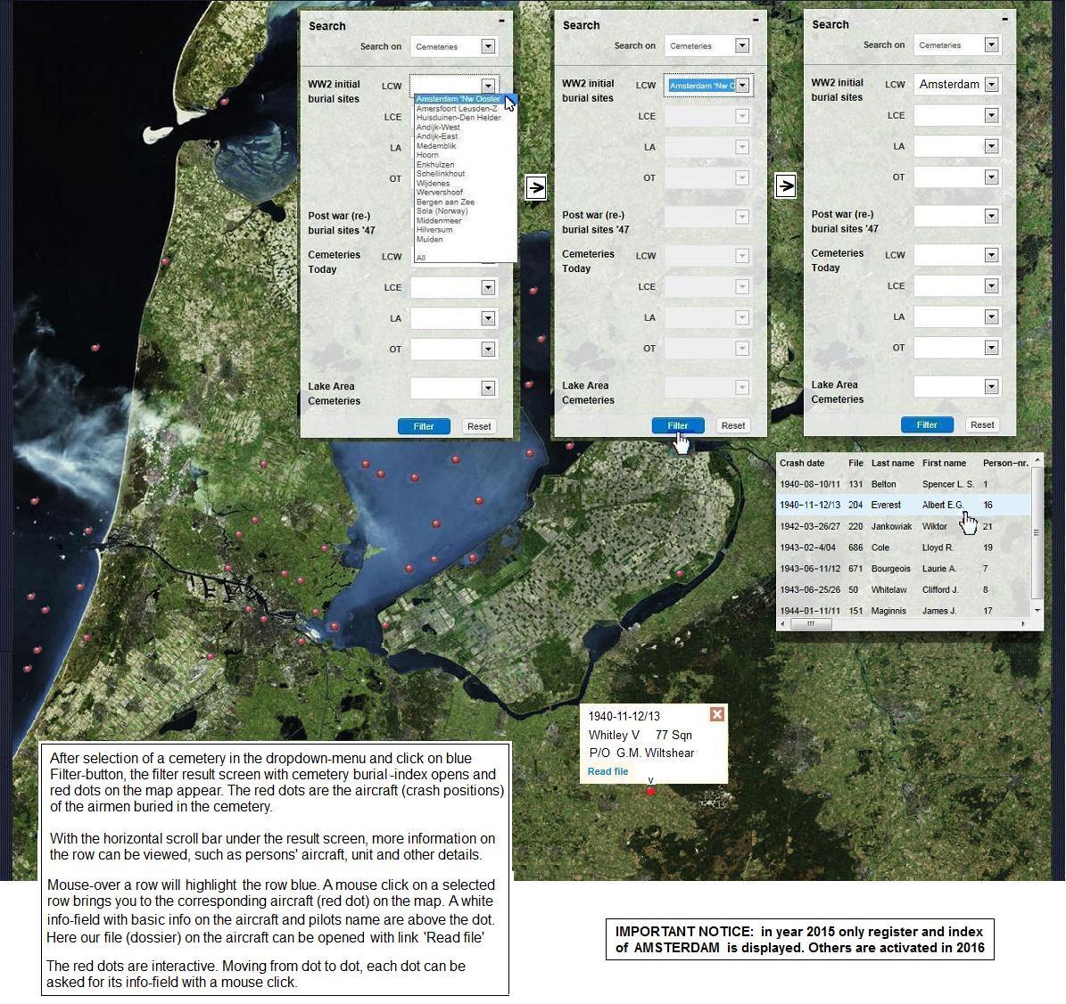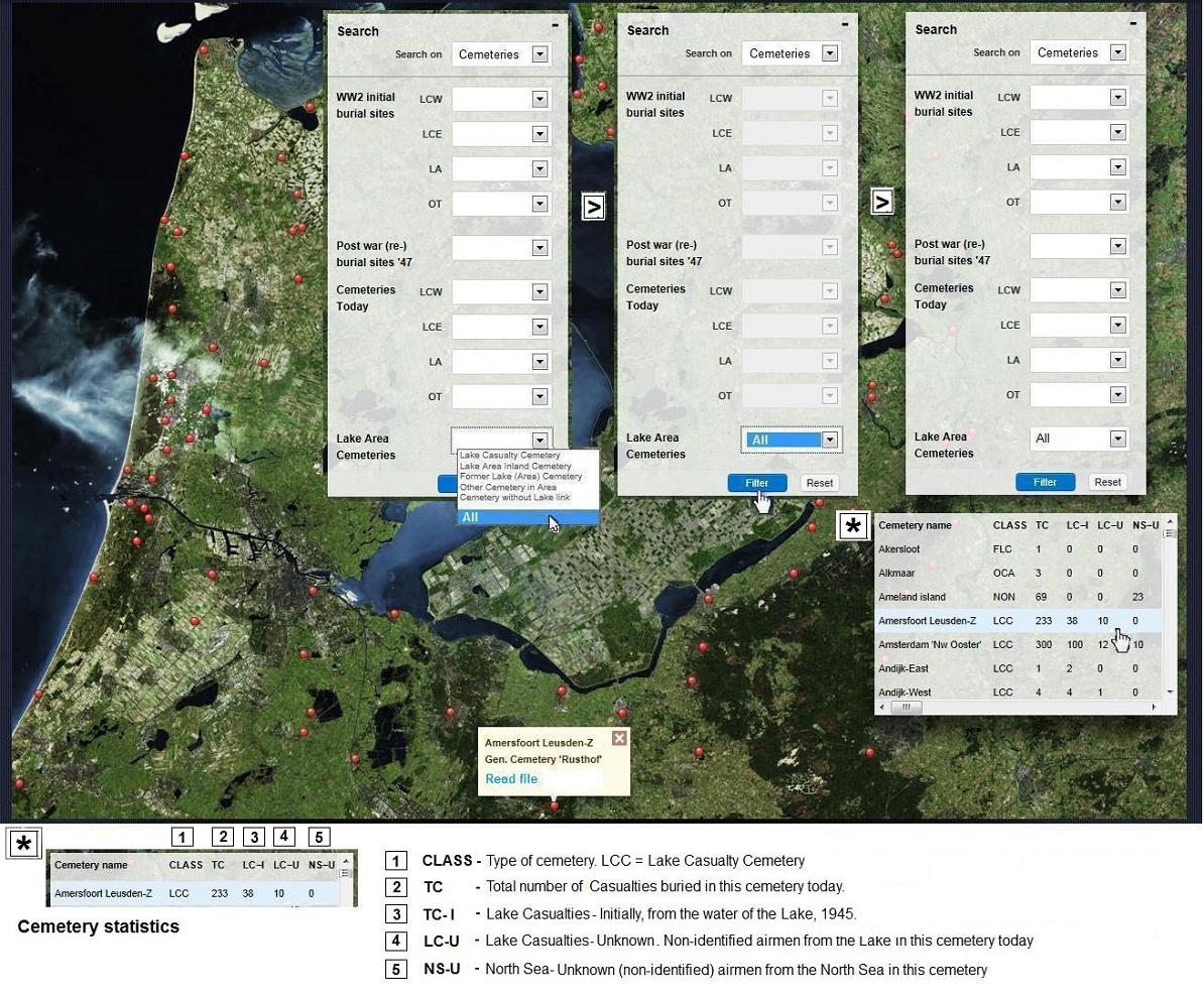 with help of dropdown menus + filter button, the most relative cemeteries to the airwar over the lake can be viewed.
