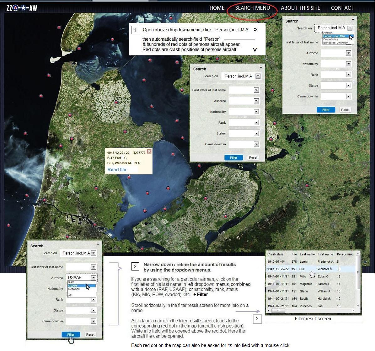 a click on a persons name in the result screen, leads to aircrafts crash position (red dot on map). File can be opened there.